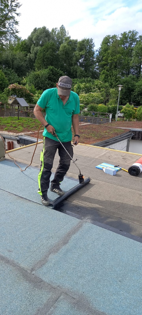 Bevor mit der Bepflanzung begonnen wird, muss das Vlies entsprechend bewässert werden. Nun kann mit der Verlegung der der Grünfläche begonnen werden. Rolle für Rolle wird auf das Dach verbracht und ausgerollt und verlegt.n Nach mehreren Stunden ist die Dachfläche komplett ausgelegt und muss nun über mehrere Wochen kontinuierlich bewässert werden, um ein Austrocknen der Dachfläche zu vermeiden. Nach getaner Arbeit war auch für das leibliche Wohl aller Helfer gesorgt. An dieser Stelle möchte sich der Vorstand bei allen Helfer nochmals bedanken.